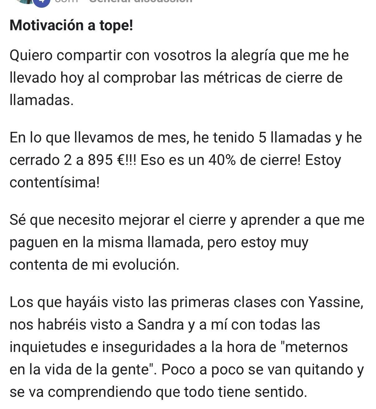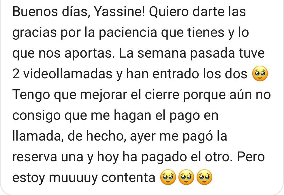 “Llevaba semanas bloqueada sin atreverme a ofrecer nada serio. Después de trabajar el guion y las objeciones con Yassin, estoy ilusionadísima con mi primera llamada siguiendo el método completo. La semana pasada ya estuve a punto de lanzarme y ahora tengo claro qué decir desde el minuto uno hasta el cierre, así que por fin siento que voy preparada de verdad.”