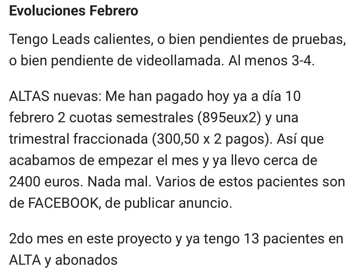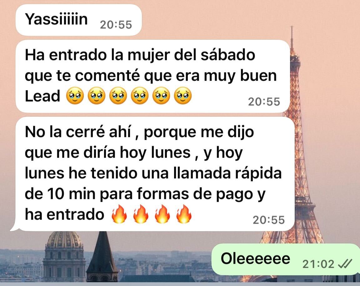 “Llevaba meses vendiendo tickets bajos sin ver un salto real. En el primer mes de aplicar el sistema, ya me han pagado 2 cuotas semestrales y una trimestral, cerca de 2.400 € en total. Lo mejor es que ahora sé exactamente qué hacer en cada fase de la llamada para que esa facturación se repita, no sea solo un golpe de suerte.”